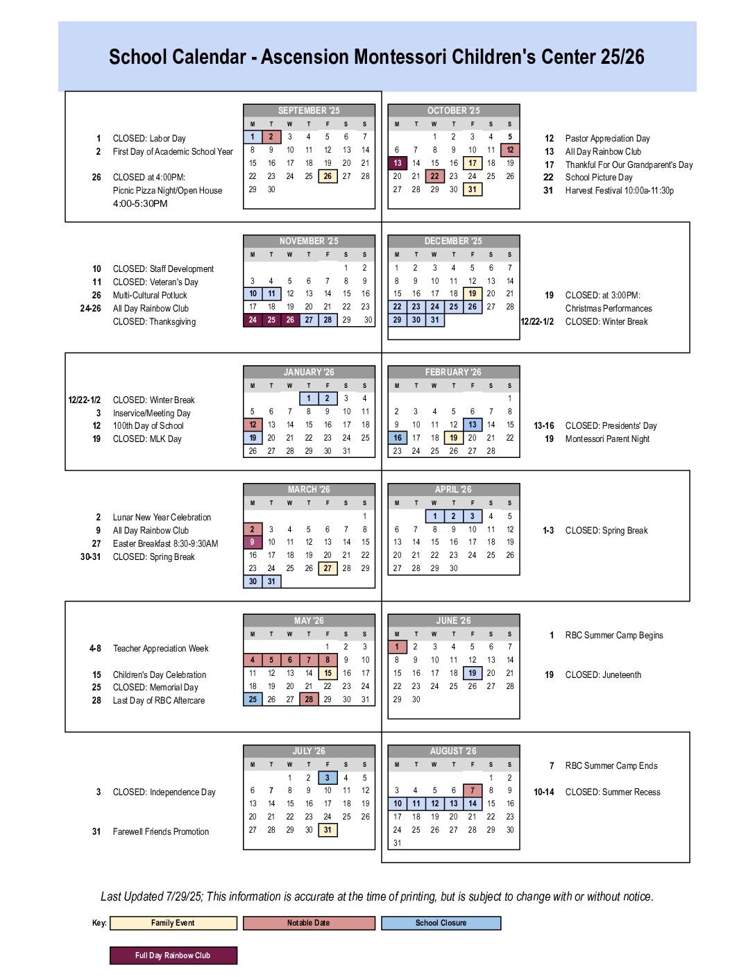 We create our school calendar with our community in mind! Our parents have opportunities to connect, our teachers have time off to recharge and be the best leaders for our classrooms, and our children are given fun ways to learn about their world. Please take a look at our calendar below and let us know if you have any questions.